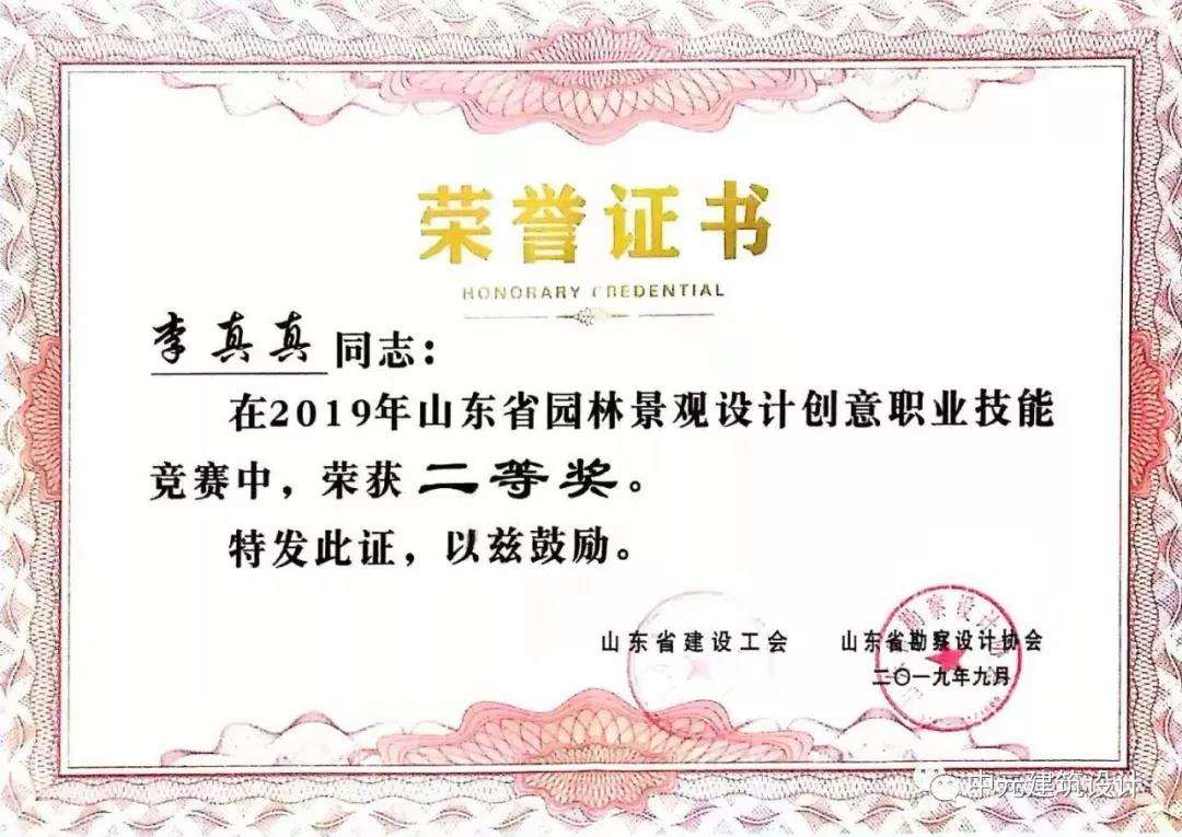 祝賀我公司李真真在2019年度山東省園林景觀設(shè)計創(chuàng)意職業(yè)技能競賽中獲得全省二等獎的驕人戰(zhàn)績。為公司和個人贏得榮譽。