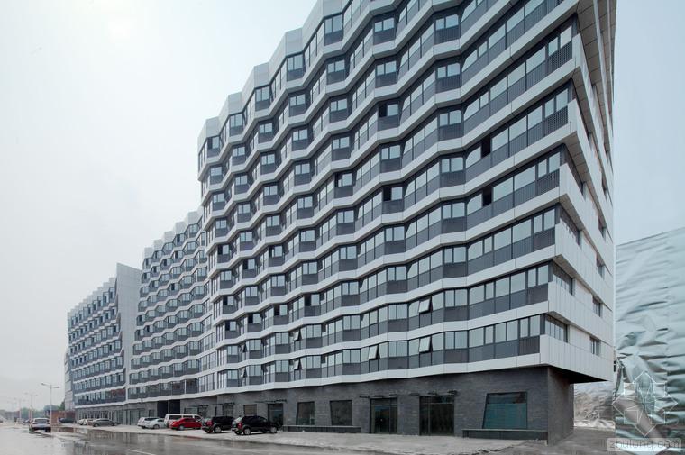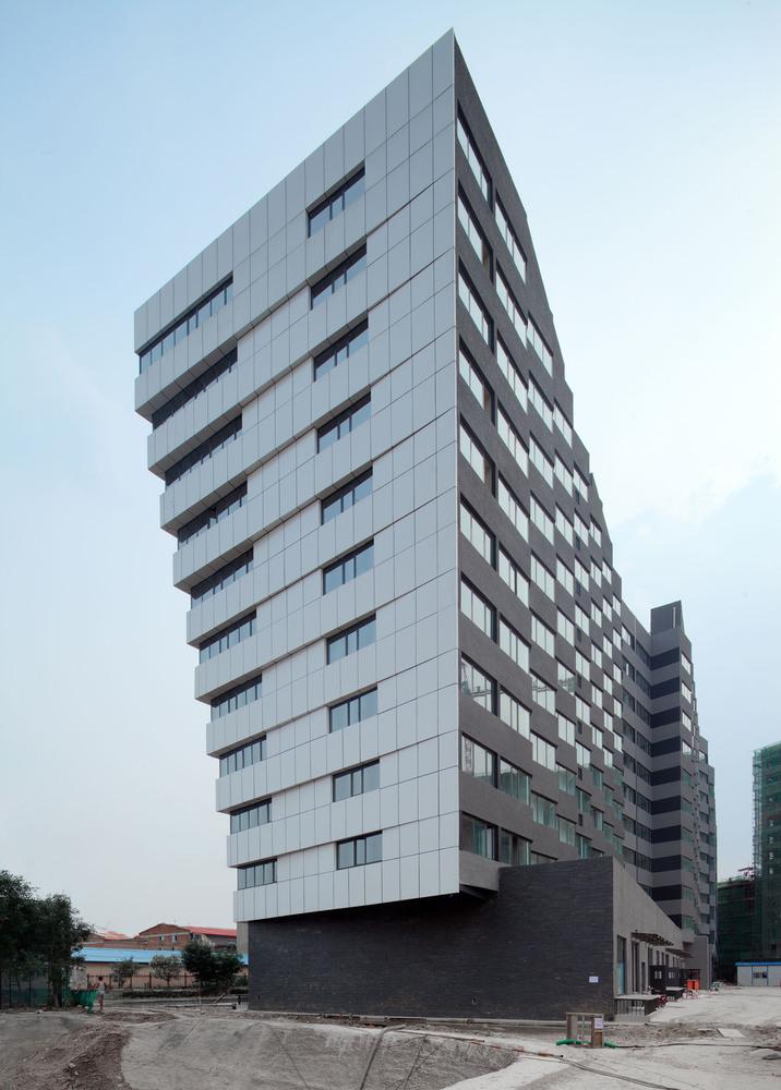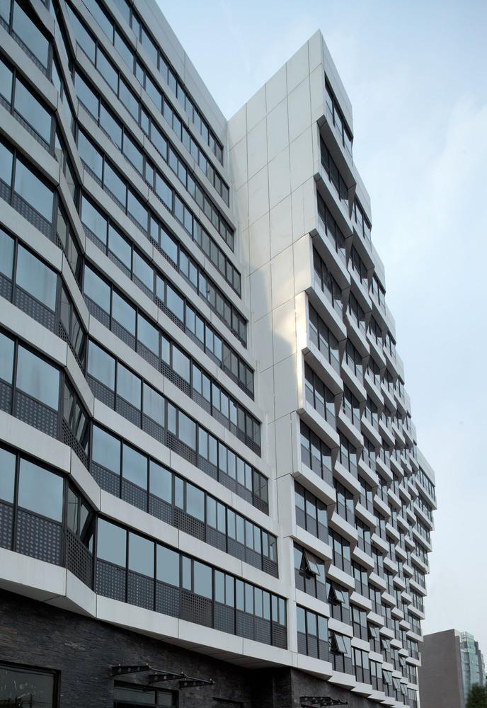 建筑的底層是展廳和商業。公寓部分在二層以上,大約占總建筑面積的三分之二,因分屬于三個投資人,業主希望從形式上有區分,突出各自的獨立性。我們以公寓面寬為基準定義出一個標準戶型的外觀形式,在南立面上進行重復,通過基本單元有序的懸挑形成錯動,發展出水平和垂直方向富有動感的體量變化,進而強調出辦公和兩部分公寓的清晰分界。于是集合體明確地呈現出四部分,一個底座和上面三個起伏的體塊,為內容的不同提供了明顯的標識。